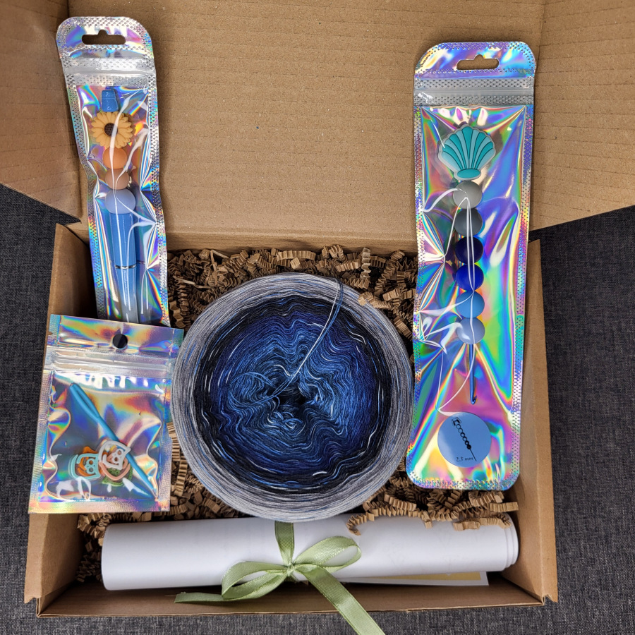 Kompletní sada k uháčkování šátku Megane. Tato pečlivě sestavená sada obsahuje vše, co potřebujete k tomu, abyste si sami uháčkovali elegantní šátek s jedinečným vzorem.