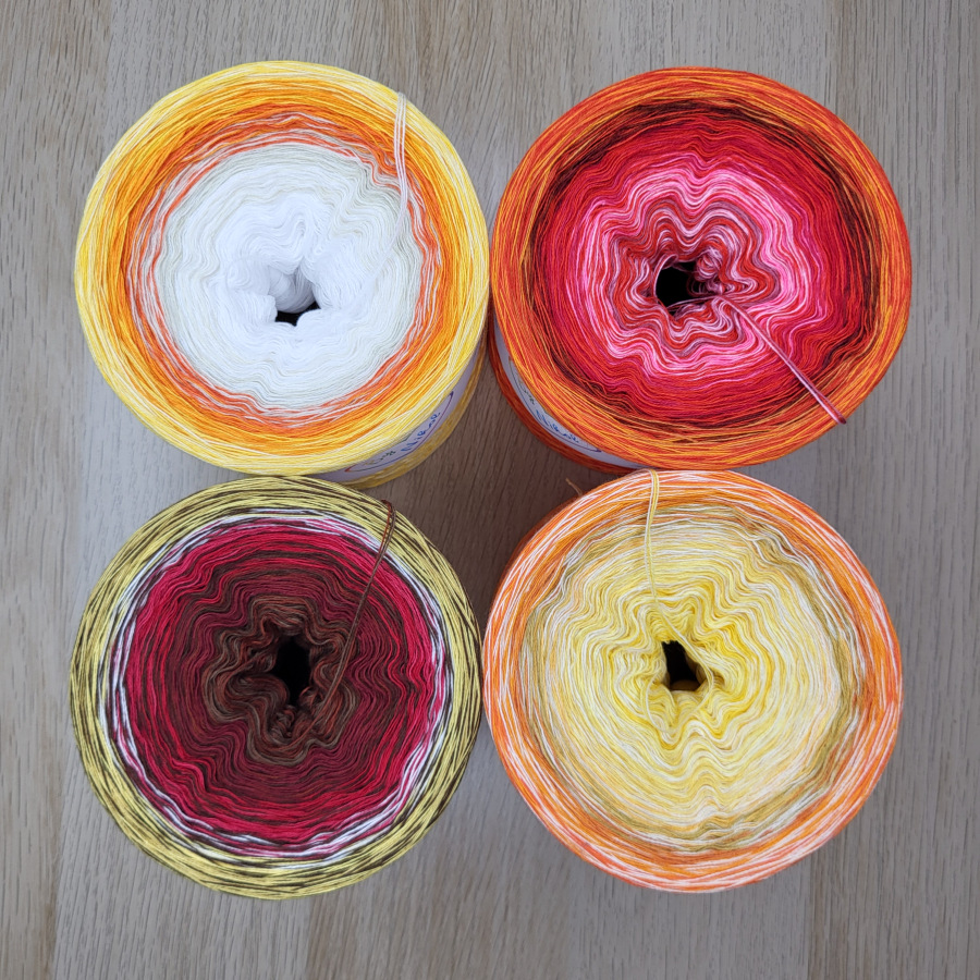 HOKUS = klubíčko, na kterém jsem zkoušela barevné kombinace, existuje jen jedno jiné, postupy na něj nějsou nikde zapsané. Přechody pravidelné, změny barev po stejných metrech. Nejde tedy o zbytkáč.