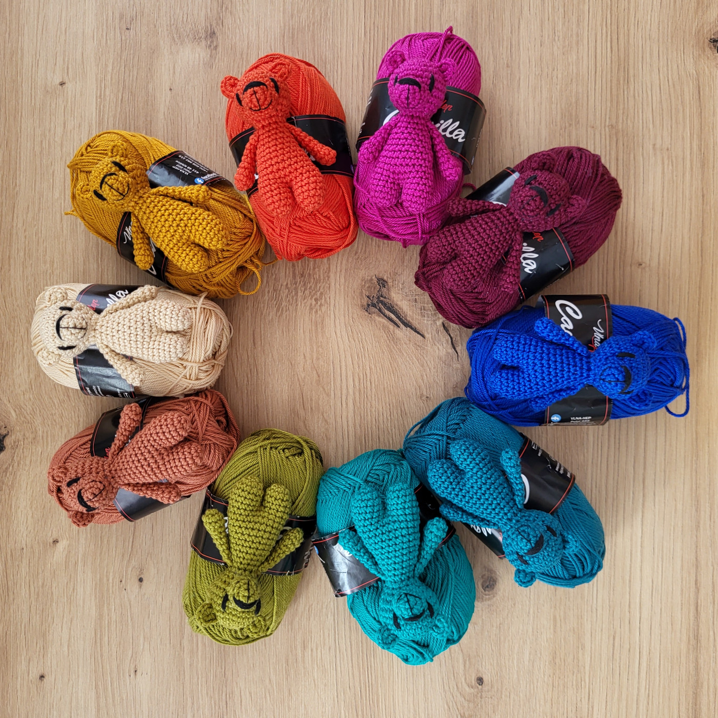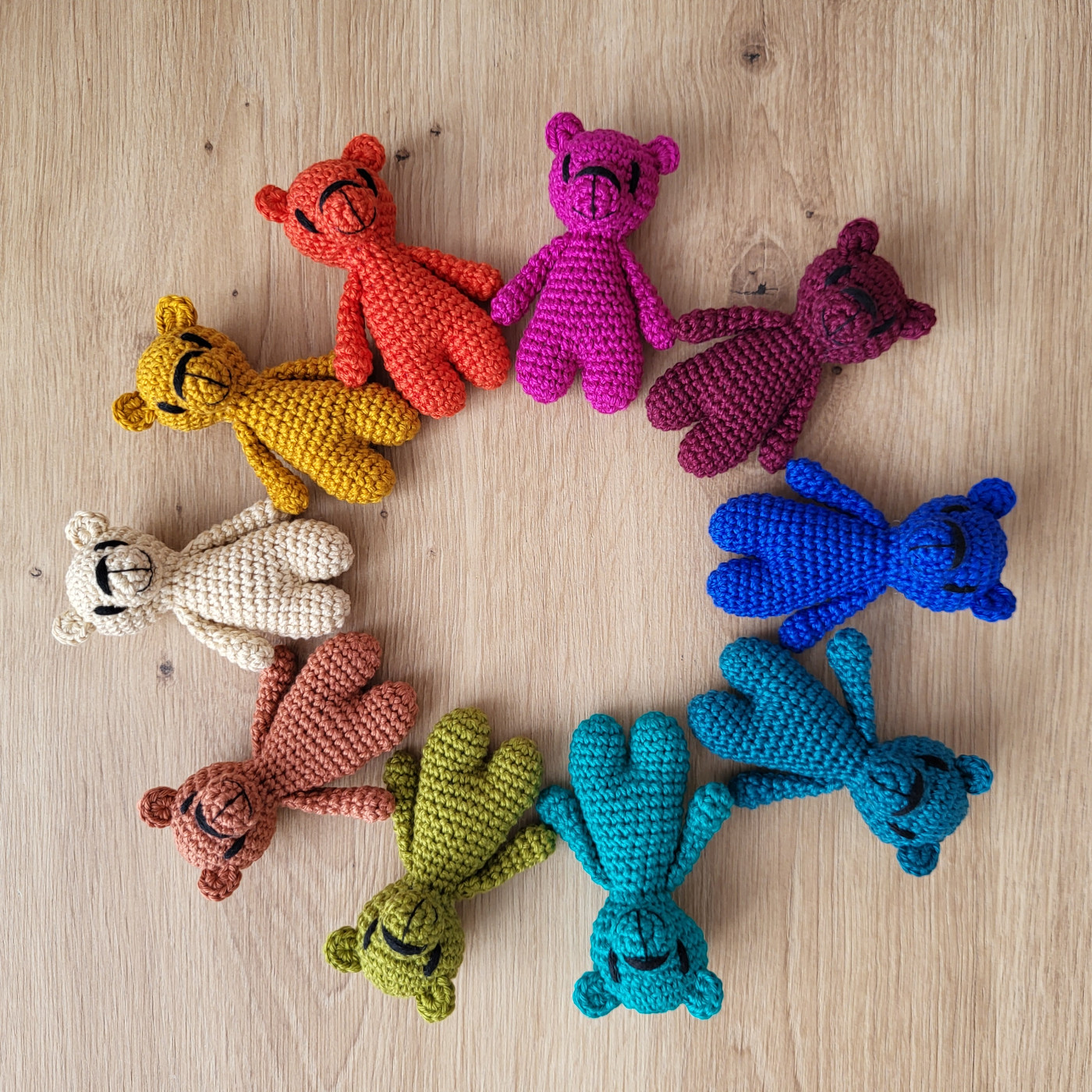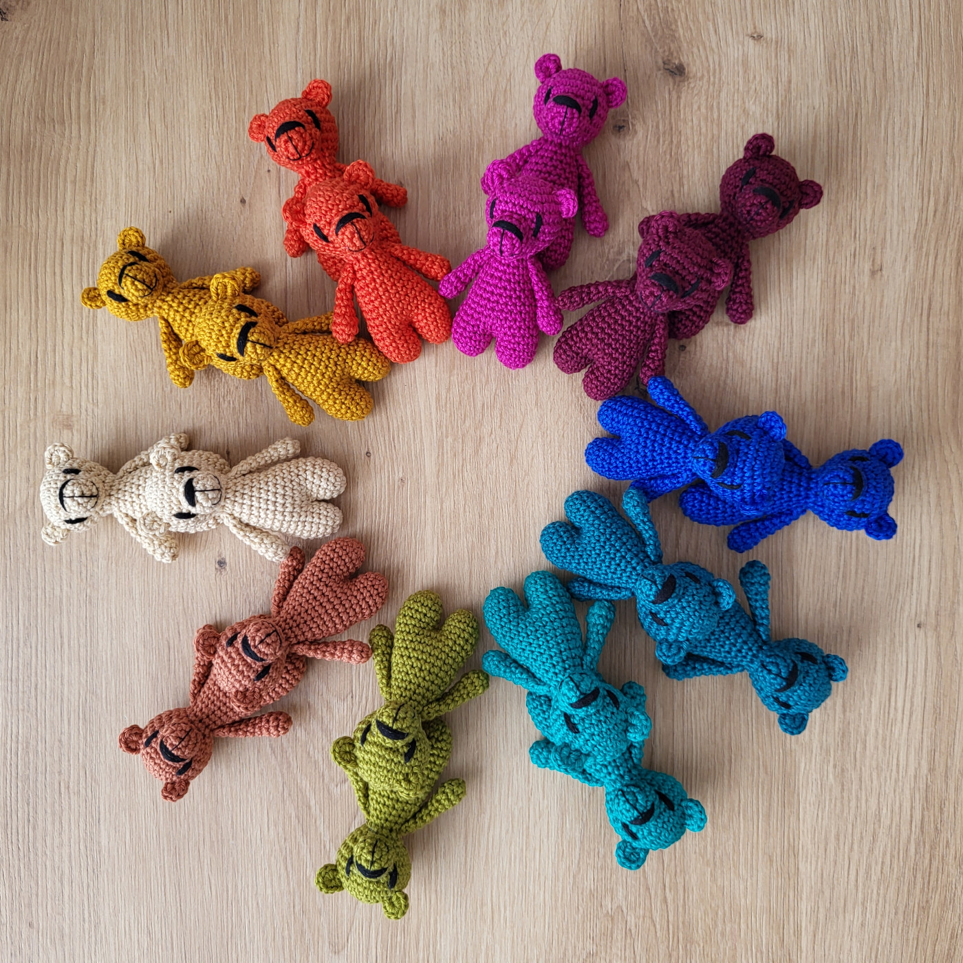 Každý medvídek vzniká ručně technikou háčkování podle návodu, který jsem si postupně přizpůsobila. Používám přízi Camilla české výroby značky Vlna Hep, která má certifikaci nezávadnosti od Textilního zkušebního ústavu a je vhodná i pro děti do 3 let. Je i zároveň dostatečně pevná, aby medvídci vydrželi každodenní objetí. Celá kolekce je tvořená deseti barevnými variantami, které jsou propojené s deseti obrazy a jejich jedinečným poselstvím.