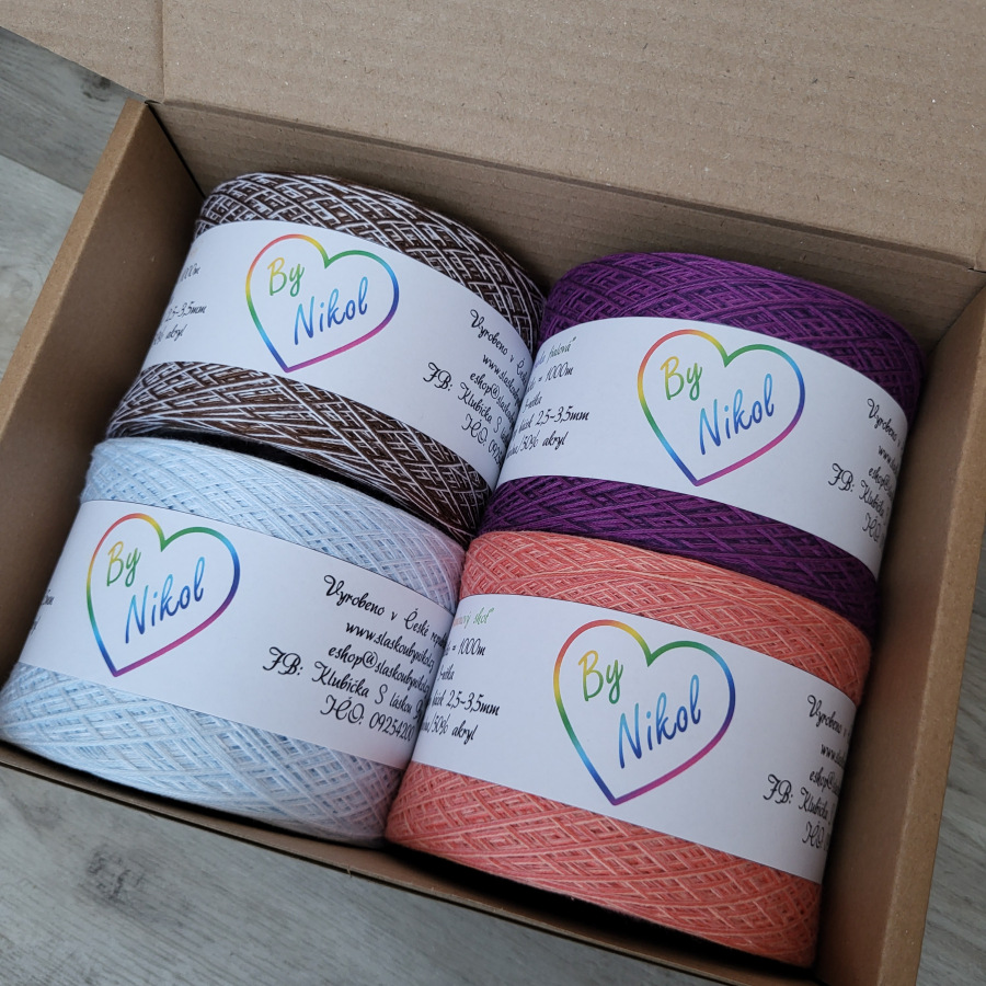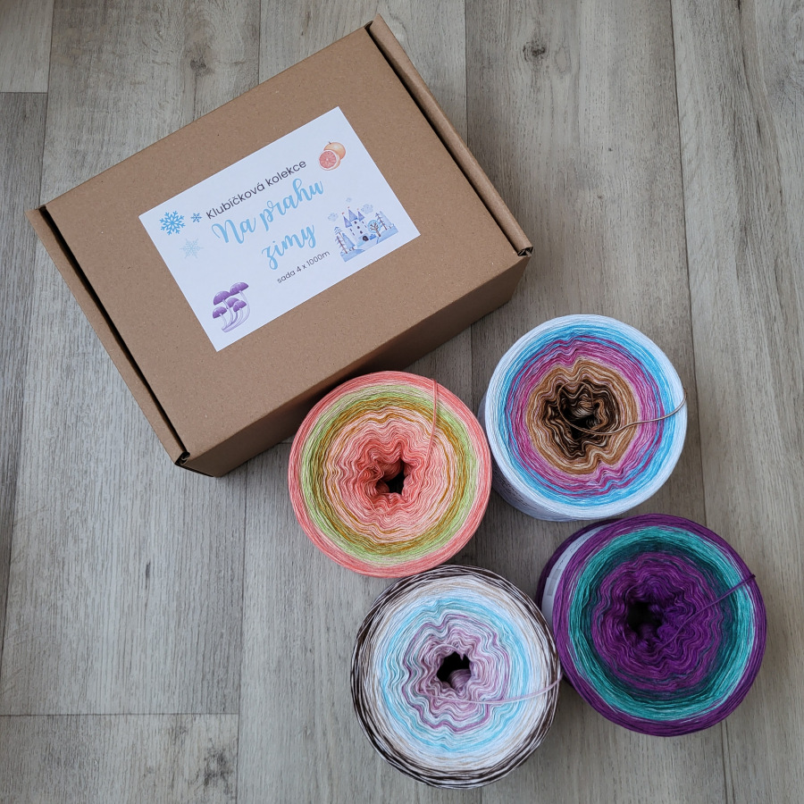 Sada se skládá z klubíček: Jablečný štrúdl 1000m / 3nitka, Pavučina podzimu 1000m / 3nitka s bavlnou, Smooth Bloody moon 1000m / 4nitka s viskózou, Švaestková povidla 1000m / 3nitka s bavlnou.